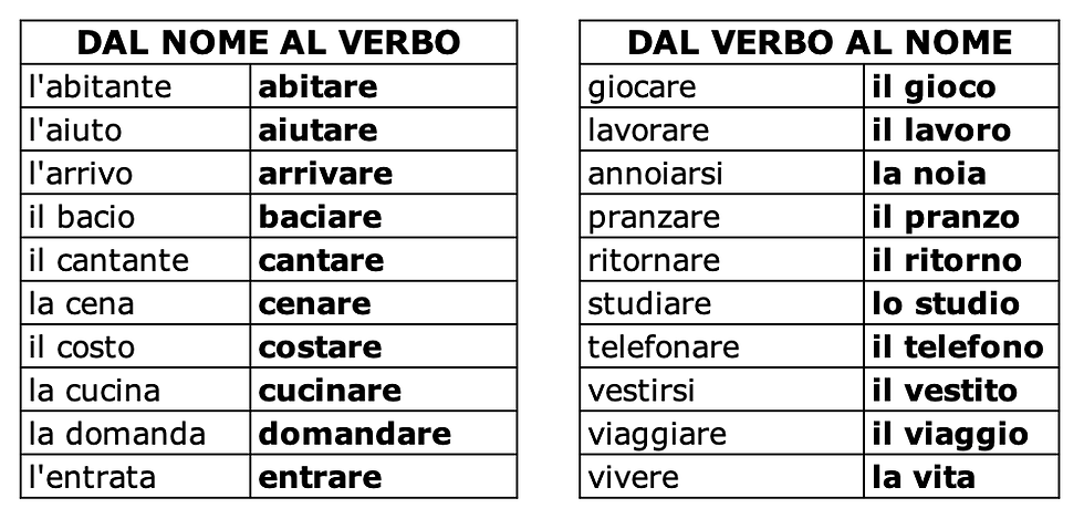Se siete stati così bravi da fare l'esercizio precedente, questo vi sembrerà uno scherzo. Nella prima tabella trovate dieci nomi. A fianco di ciascun nome dovete scrivere il verbo collegato (per esempio: il lavoro > lavorare). Nella colonna di destra invece dovete fare il contrario: vicino a ogni verbo scrivete il nome corrispondente (per esempio: lavorare > il lavoro). Facile sì, ma qualche problemino può saltare fuori.